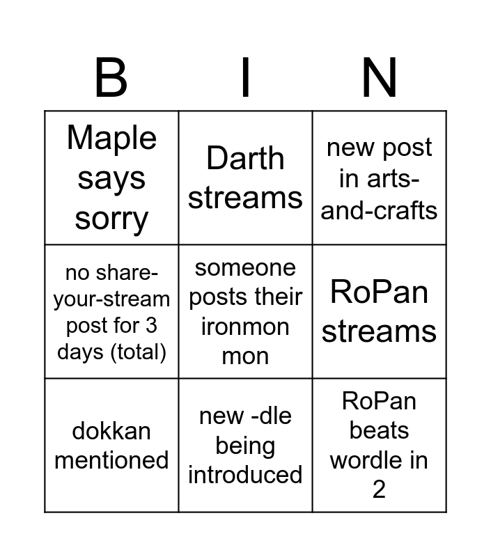 This bingo card has 12 words: Good morning train, RoPan beats wordle in 2, someone posts their ironmon mon, RoPan streams, Darth streams, new post in arts-and-crafts, new -dle being introduced, someone joins the discord, Maple says sorry, no share-your-stream post for 3 days (total), dokkan mentioned and Maple plays PoE/PoE2.