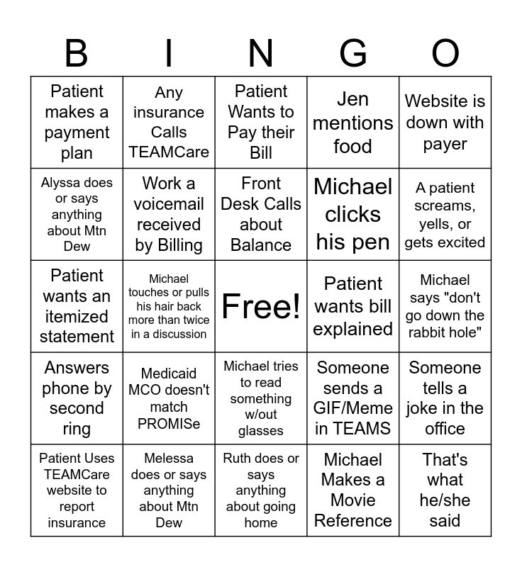 This bingo card has a free space and 24 words: Patient Uses TEAMCare website to report insurance, Medicaid MCO doesn't match PROMISe, Front Desk Calls about Balance, Michael Makes a Movie Reference, Website is down with payer, Patient makes a payment plan, Any insurance Calls TEAMCare, Patient Wants to Pay their Bill, Patient wants bill explained, Michael says "don't go down the rabbit hole", Patient wants an itemized statement, Work a voicemail received by Billing, Someone sends a GIF/Meme in TEAMS, Someone tells a joke in the office, Alyssa does or says anything about Mtn Dew, Melessa does or says anything about Mtn Dew, Ruth does or says anything about going home, Jen mentions food, A patient screams, yells, or gets excited, Answers phone by second ring, Michael touches or pulls his hair back more than twice in a discussion, Michael tries to read something w/out glasses, Michael clicks his pen and That's what he/she said.