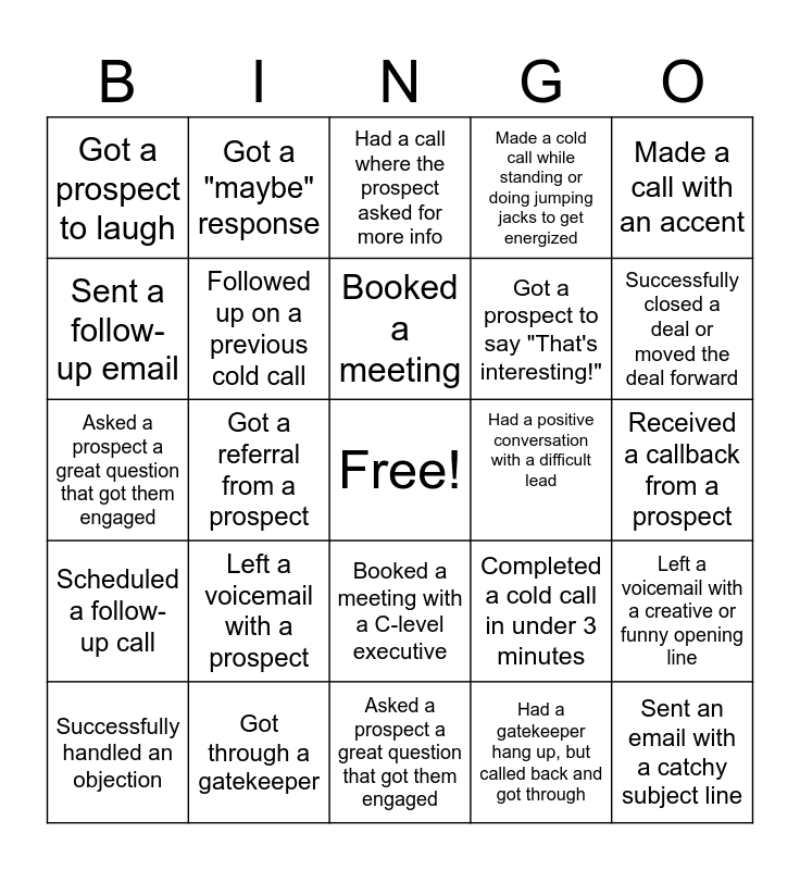 This bingo card has a free space and 24 words: Left a voicemail with a prospect, Got through a gatekeeper, Booked a meeting, Successfully handled an objection, Made a call with an accent, Got a prospect to laugh, Sent a follow-up email, Got a "maybe" response, Had a positive conversation with a difficult lead, Booked a meeting with a C-level executive, Got a prospect to say "That's interesting!", Asked a prospect a great question that got them engaged, Completed a cold call in under 3 minutes, Left a voicemail with a creative or funny opening line, Followed up on a previous cold call, Had a gatekeeper hang up, but called back and got through, Received a callback from a prospect, Had a call where the prospect asked for more info, Successfully closed a deal or moved the deal forward, Got a referral from a prospect, Sent an email with a catchy subject line, Scheduled a follow-up call, Made a cold call while standing or doing jumping jacks to get energized and Asked a prospect a great question that got them engaged.