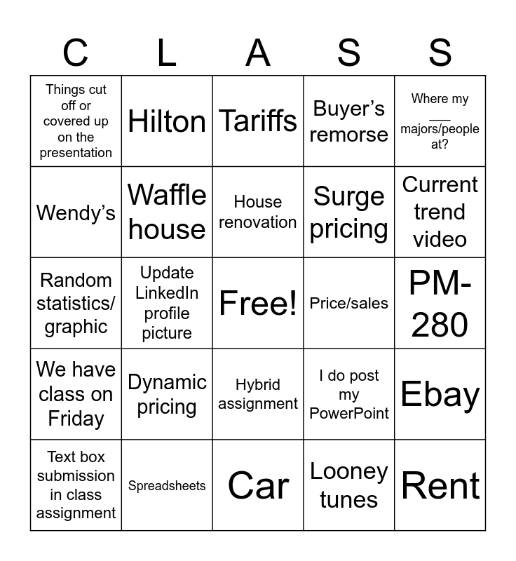 This bingo card has a free space and 34 words: Congestion pricing, Looney tunes, Big bang theory/ Friends clip, Flipped classroom, We have class on Friday, Waffle house, Where my ___ majors/people at?, Text box submission in class assignment, Hilton, Eggs, House renovation, Tariffs, Stock photo, Assignment that makes no sense, Price/sales, Current trend video, Spreadsheets, Random statistics/ graphic, Dynamic pricing, I do post my PowerPoint, Hybrid assignment, Screenshot of upcoming assignment, Things cut off or covered up on the presentation, PM-280, Car, Rent, Buyer’s remorse, Golf clubs, Surge pricing, Wendy’s, Casinos, Update LinkedIn profile picture, Ebay and Defines the same term twice.