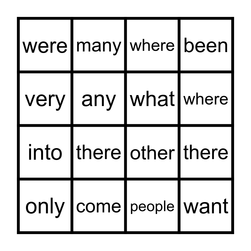 This bingo card has 16 words: come, there, where, were, into, many, other, people, very, any, only, been, there, where, what and want.
