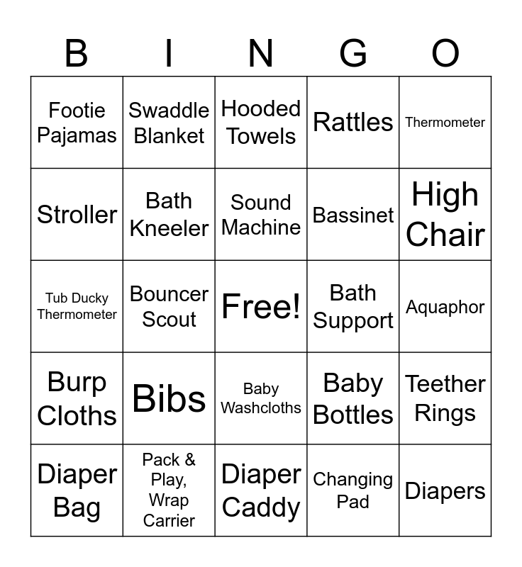 This bingo card has a free space and 30 words: Pack & Play, Wrap Carrier, Simple Sway Swing, Bouncer Scout, Play Gym Mall, Footie Pajamas, Hooded Towels, Bath Kneeler, Baby Washcloths, Bath Support, Diaper Caddy, Aquaphor, Diapers, Changing Pad, Diaper Genie, High Chair, Pop & Sit Booster, Baby Bottles, Burp Cloths, Bibs, Thermometer, Tub Ducky Thermometer, Pacifier, Swaddle Blanket, Bassinet, Stroller, Rattles, Teether Rings, Diaper Bag, Sound Machine and Crib Mobile.