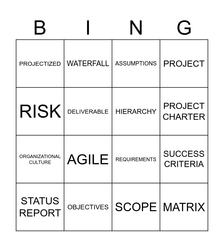 This bingo card has 16 words: OBJECTIVES, SUCCESS CRITERIA, ASSUMPTIONS, PROJECTIZED, ORGANIZATIONAL CULTURE, WATERFALL, REQUIREMENTS, SCOPE, RISK, DELIVERABLE, STATUS REPORT, PROJECT, AGILE, PROJECT CHARTER, HIERARCHY and MATRIX.