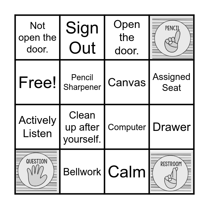 This bingo card has 3 images and 13 words: Bellwork, Drawer, Open the door., Not open the door., Actively Listen, Sign Out, Computer, Calm, Free!, Pencil Sharpener, Clean up after yourself., Assigned Seat and Canvas.