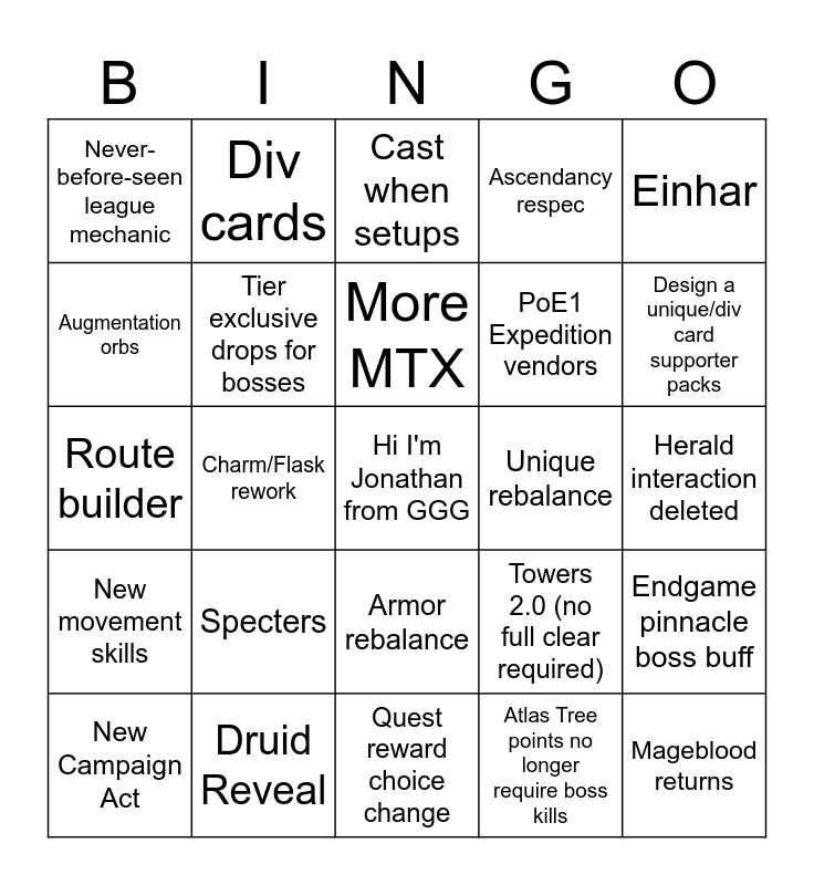 This bingo card has a free space and 24 words: Specters, Druid Reveal, More MTX, New Campaign Act, Einhar, Never-before-seen league mechanic, Augmentation orbs, Div cards, Unique rebalance, Armor rebalance, PoE1 Expedition vendors, Route builder, Towers 2.0 (no full clear required), Endgame pinnacle boss buff, Tier exclusive drops for bosses, Atlas Tree points no longer require boss kills, Herald interaction deleted, Cast when setups, Design a unique/div card supporter packs, Charm/Flask rework, Mageblood returns, New movement skills, Ascendancy respec and Quest reward choice change.