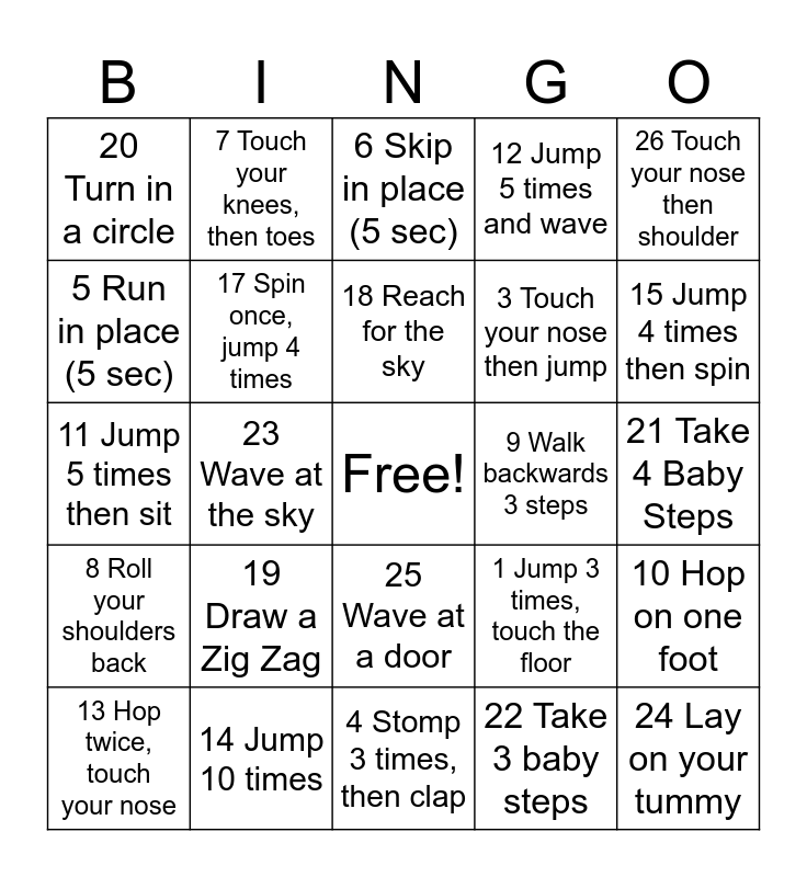 This bingo card has a free space and 27 words: 1 Jump 3 times, touch the floor, 2 Clap once and touch your toes, 3 Touch your nose then jump, 4 Stomp 3 times, then clap, 5 Run in place (5 sec), 6 Skip in place (5 sec), 7 Touch your knees, then toes, 8 Roll your shoulders back, 9 Walk backwards 3 steps, 10 Hop on one foot, 11 Jump 5 times then sit, 12 Jump 5 times and wave, 13 Hop twice, touch your nose, 14 Jump 10 times, 15 Jump 4 times then spin, 16 Spin 3 times then jump, 17 Spin once, jump 4 times, 18 Reach for the sky, 19 Draw a Zig Zag, 20 Turn in a circle, 21 Take 4 Baby Steps, 22 Take 3 baby steps, 23 Wave at the sky, 24 Lay on your tummy, 25 Wave at a door, 26 Touch your nose then shoulder and 27 Turn in a circle then skip.