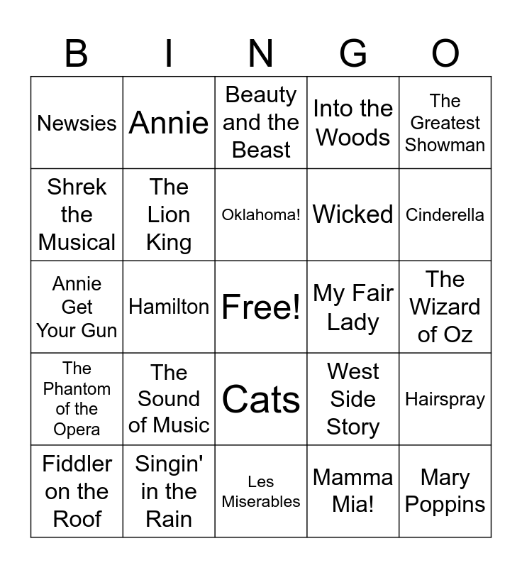 This bingo card has a free space and 24 words: The Sound of Music, Singin' in the Rain, Oklahoma!, Fiddler on the Roof, The Greatest Showman, Newsies, Shrek the Musical, Annie, My Fair Lady, Cats, Wicked, Annie Get Your Gun, West Side Story, Hairspray, The Lion King, Mamma Mia!, The Wizard of Oz, Beauty and the Beast, Cinderella, Hamilton, Mary Poppins, The Phantom of the Opera, Into the Woods and Les Miserables.