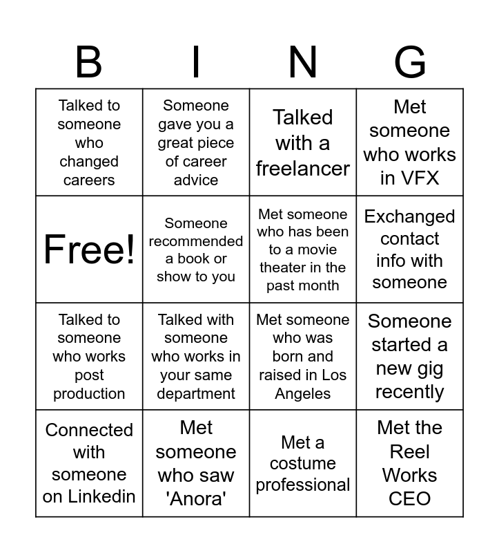 This bingo card has 16 words: Met someone who saw 'Anora', Someone started a new gig recently, Talked with a freelancer, Talked to someone who changed careers, Talked to someone who works post production, Someone gave you a great piece of career advice, Met someone who was born and raised in Los Angeles, Met a costume professional, Free!, Someone recommended a book or show to you, Connected with someone on Linkedin, Met someone who works in VFX, Talked with someone who works in your same department, Exchanged contact info with someone, Met someone who has been to a movie theater in the past month and Met the Reel Works CEO.
