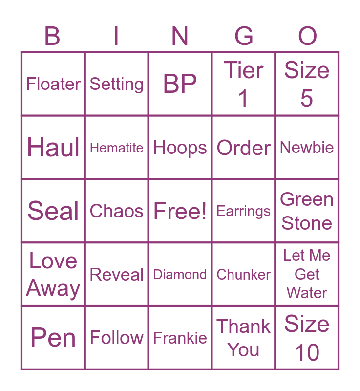 This bingo card has a free space and 73 words: 2424, BORG, BP, Black Onyx, Blue Stone, Broken, Chaos, Charm, Chunker, Cone, Coupon Code, Dainty, Diamond, Earrings, Fizzcano, Floater, Follow, Frankie, Gold, Green Stone, Haul, Hematite, Hoops, Lemon, Let Me Get Water, Likes, 10k, 20k, 30k, Link in Bio, Love Away, Lucky Last, Mystery Hostess, Necklace, Newbie, OG, OpenBag, Openline Up, Order, Peaker, Pen, Reveal, Rhodium, Ring Board, Rose Gold, Seal, Setting, Ship, Sinker, Size 5, Size 6, Size 7, Size 8, Size 9, Size 10, Size 11, Smokey Topaz, Speedcode, Spoon, Stacks, Sterling, Straw Topper, Studs, Tier 1, Tier 2, Tier 3, Tier 4, Gifts, Thank You, Heart Puffs, Chili's, Tiny Diny and Confetti.