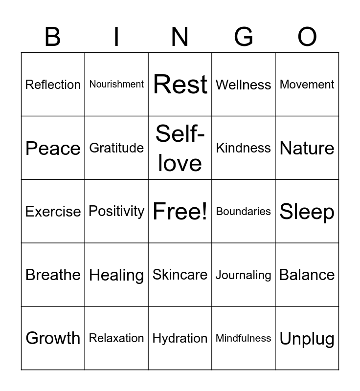 This bingo card has a free space and 25 words: Healing, Hydration, Self-love, Growth, Movement, Reflection, Peace, Nourishment, Boundaries, Skincare, Kindness, Exercise, Journaling, Balance, Gratitude, Meditation, Sleep, Rest, Nature, Positivity, Unplug, Relaxation, Breathe, Wellness and Mindfulness.