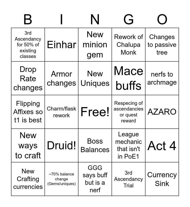 This bingo card has a free space and 24 words: Druid!, ~70% balance change (Gems/uniques), New Uniques, New Crafting currencies, Changes to passive tree, 3rd Ascendancy for 50% of existing classes, Drop Rate changes, Einhar, Respecing of ascendancies or quest reward, Boss Balances, Mace buffs, Flipping Affixes so t1 is best, League mechanic that isn't in PoE1, Act 4, Armor changes, 3rd Ascendancy Trial, AZARO, New minion gem, nerfs to archmage, Charm/flask rework, Currency Sink, New ways to craft, Rework of Chalupa Monk and GGG says buff but is a nerf.