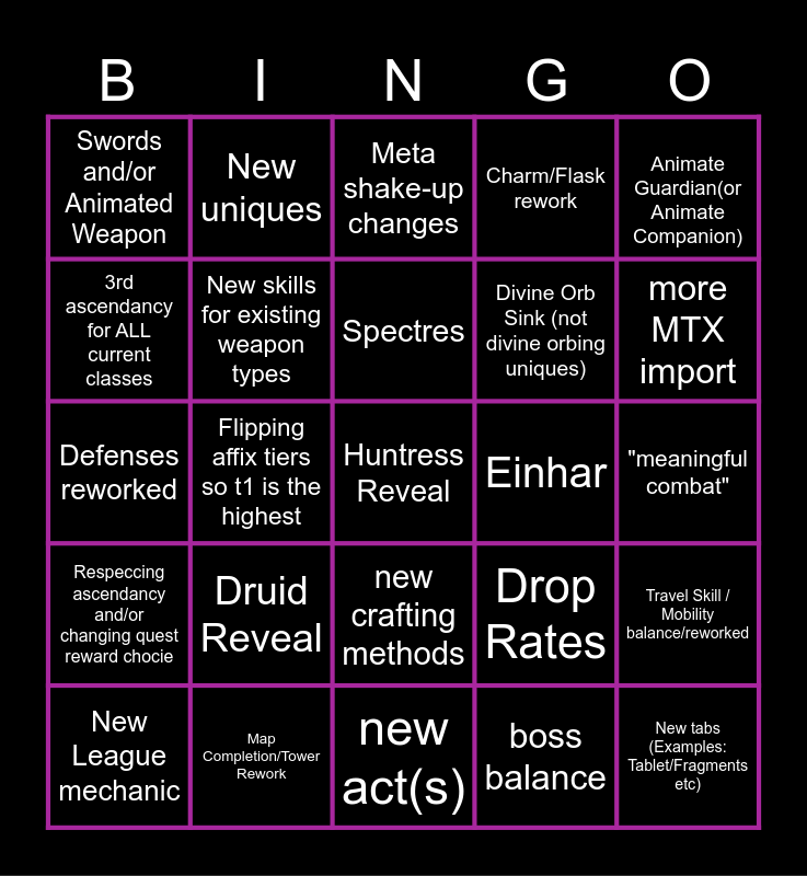 This bingo card has a free space and 24 words: Druid Reveal, Map Completion/Tower Rework, Spectres, New League mechanic, Animate Guardian(or Animate Companion), Swords and/or Animated Weapon, 3rd ascendancy for ALL current classes, New uniques, Einhar, new crafting methods, Divine Orb Sink (not divine orbing uniques), Defenses reworked, Drop Rates, Travel Skill / Mobility balance/reworked, New skills for existing weapon types, boss balance, "meaningful combat", Meta shake-up changes, more MTX import, Flipping affix tiers so t1 is the highest, New tabs (Examples: Tablet/Fragments etc), Respeccing ascendancy and/or changing quest reward chocie, Charm/Flask rework and new act(s).