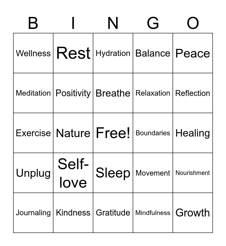 This bingo card has a free space and 25 words: Self-love, Gratitude, Breathe, Journaling, Peace, Wellness, Meditation, Rest, Boundaries, Sleep, Relaxation, Exercise, Movement, Nourishment, Positivity, Skincare, Healing, Hydration, Reflection, Nature, Growth, Kindness, Unplug, Balance and Mindfulness.