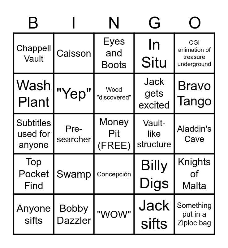 This bingo card has a free space and 24 words: Swamp, Bobby Dazzler, Wood "discovered", Anyone sifts, CGI animation of treasure underground, Chappell Vault, Wash Plant, Caisson, Vault-like structure, Concepción, Jack gets excited, Subtitles used for anyone, Billy Digs, Knights of Malta, "Yep", Jack sifts, Aladdin's Cave, Eyes and Boots, Bravo Tango, Pre-searcher, Something put in a Ziploc bag, Top Pocket Find, In Situ and "WOW".