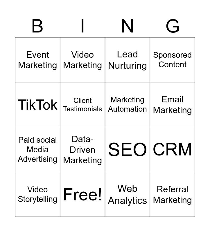 This bingo card has 24 words: LinkedIn, Content Marketing, Email Marketing, PPC Advertising, TikTok, Event Marketing, Client Testimonials, Video Marketing, Free!, Instagram, Paid social Media Advertising, SEO, Influencer Marketing, Content Marketing, Marketing Automation, Webinars, Web Analytics, Lead Nurturing, Data-Driven Marketing, CRM, Video Storytelling, Referral Marketing, Sponsored Content and Thought Leadership.