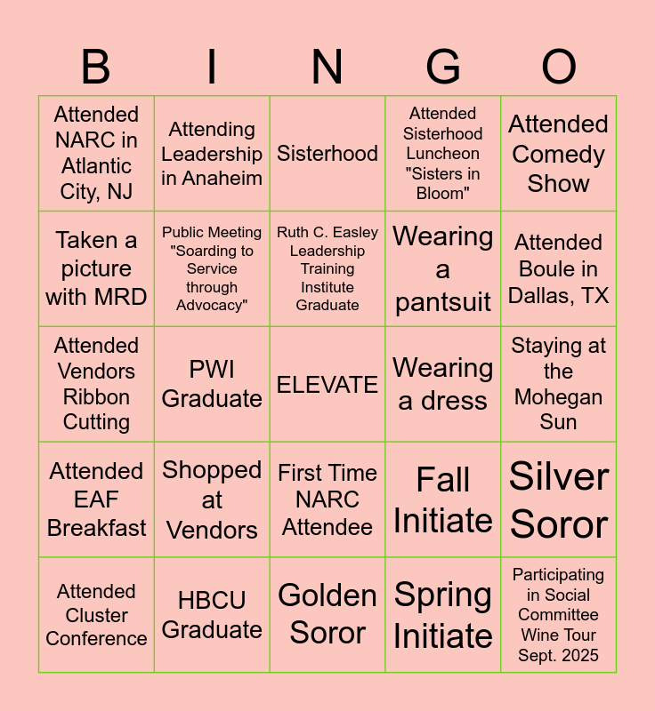 This bingo card has a free space and 26 words: First Time NARC Attendee, Spring Initiate, Ruth C. Easley Leadership Training Institute Graduate, HBCU Graduate, Attended Comedy Show, Attended NARC in Atlantic City, NJ, Taken a picture with MRD, Attending Leadership in Anaheim, Staying at the Mohegan Sun, Fall Initiate, Wearing a pantsuit, Attended Vendors Ribbon Cutting, Silver Soror, Attended Cluster Conference, PWI Graduate, Legacy, Attended Sisterhood Luncheon "Sisters in Bloom", Attended EAF Breakfast, Sisterhood, Participating in Social Committee Wine Tour Sept. 2025, Attended Boule in Dallas, TX, Golden Soror, Wearing a dress, Shopped at Vendors, Public Meeting "Soarding to Service through Advocacy" and Public Meeting After-Party ft. D-Nice.
