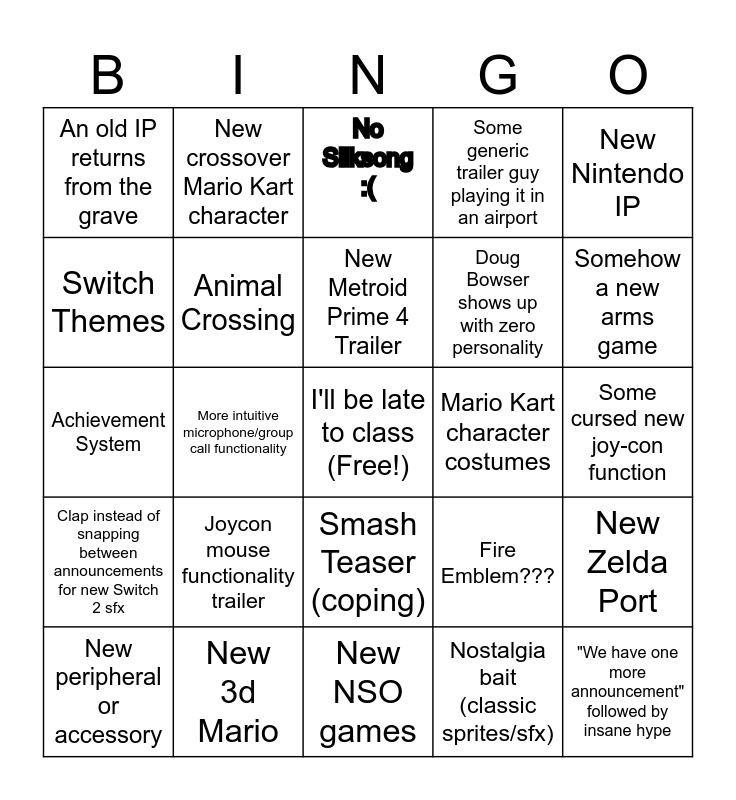 This bingo card has a free space and 24 words: Joycon mouse functionality trailer, New 3d Mario, New Metroid Prime 4 Trailer, New peripheral or accessory, New Nintendo IP, An old IP returns from the grave, Switch Themes, New crossover Mario Kart character, Mario Kart character costumes, Smash Teaser (coping), Doug Bowser shows up with zero personality, Achievement System, Fire Emblem???, New Zelda Port, Animal Crossing, Nostalgia bait (classic sprites/sfx), Some cursed new joy-con function, No Silksong :(, Somehow a new arms game, More intuitive microphone/group call functionality, "We have one more announcement" followed by insane hype, Clap instead of snapping between announcements for new Switch 2 sfx, Some generic trailer guy playing it in an airport and New NSO games.