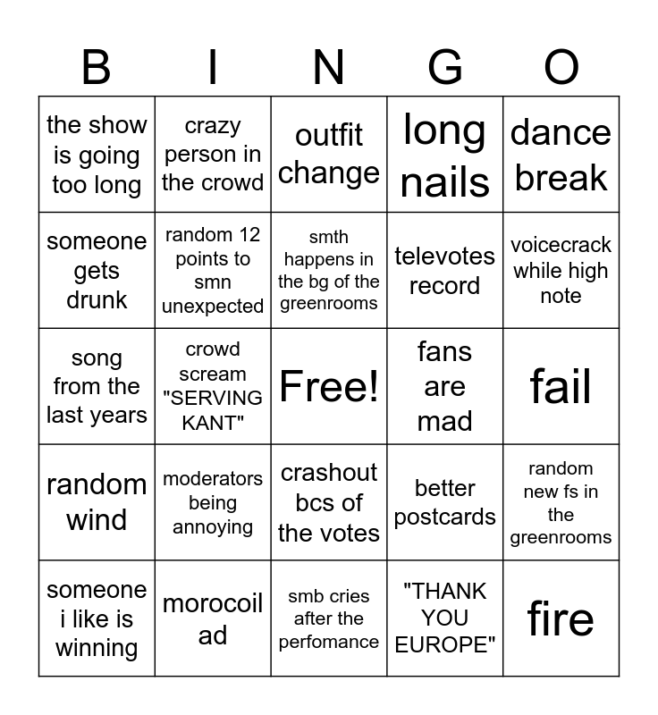 This bingo card has a free space and 24 words: moderators being annoying, morocoil ad, smth happens in the bg of the greenrooms, someone i like is winning, dance break, the show is going too long, someone gets drunk, crazy person in the crowd, fans are mad, crashout bcs of the votes, televotes record, song from the last years, better postcards, random new fs in the greenrooms, random 12 points to smn unexpected, "THANK YOU EUROPE", fail, outfit change, voicecrack while high note, crowd scream "SERVING KANT", fire, random wind, long nails and smb cries after the perfomance.