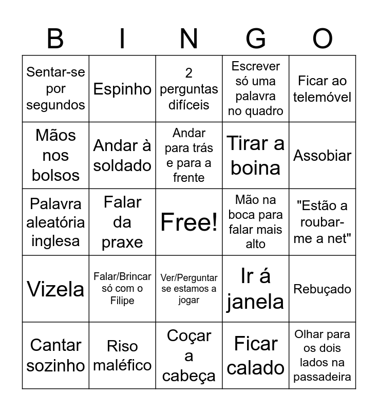 This bingo card has a free space and 27 words: Ir á janela, RRRRR...., Tirar a boina, Coçar a cabeça, Mãos nos bolsos, 2 perguntas difíceis, Espinho, Vizela, Mão na boca para falar mais alto, Rebuçado, Palavra aleatória inglesa, Escrever só uma palavra no quadro, Cantar sozinho, Riso maléfico, Assobiar, Apontar para a pessoa, Andar à soldado, Andar para trás e para a frente, Falar/Brincar só com o Filipe, Sentar-se por segundos, "Estão a roubar-me a net", Ficar calado, Falar da praxe, Olhar para os dois lados na passadeira, Ver/Perguntar se estamos a jogar, Ficar ao telemóvel and Fazer uma pergunta e nunca aceitar uma resposta.