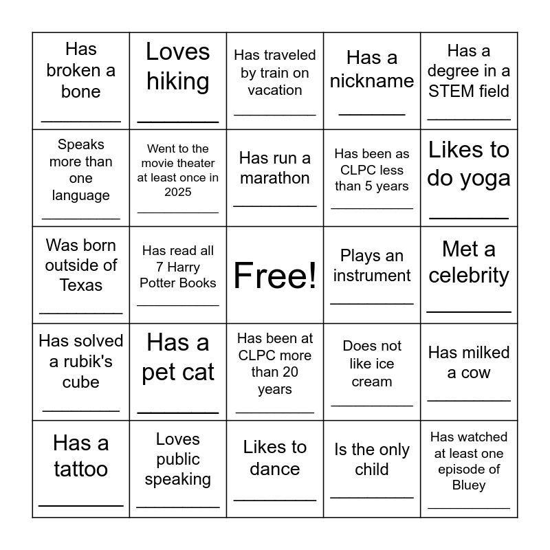 This bingo card has a free space and 24 words: Has a pet cat ______, Loves public speaking _________, Has run a marathon _________, Has a tattoo _______, Has a degree in a STEM field _________, Has broken a bone ________, Speaks more than one language __________, Loves hiking ______, Plays an instrument _________, Has been at CLPC more than 20 years __________, Has been as CLPC less than 5 years ___________, Was born outside of Texas _________, Does not like ice cream __________, Has milked a cow _________, Went to the movie theater at least once in 2025 ____________, Is the only child _________, Met a celebrity _______, Has traveled by train on vacation __________, Likes to do yoga ______, Has read all 7 Harry Potter Books ___________, Has watched at least one episode of Bluey ___________, Has solved a rubik's cube ________, Has a nickname ______ and Likes to dance ________.