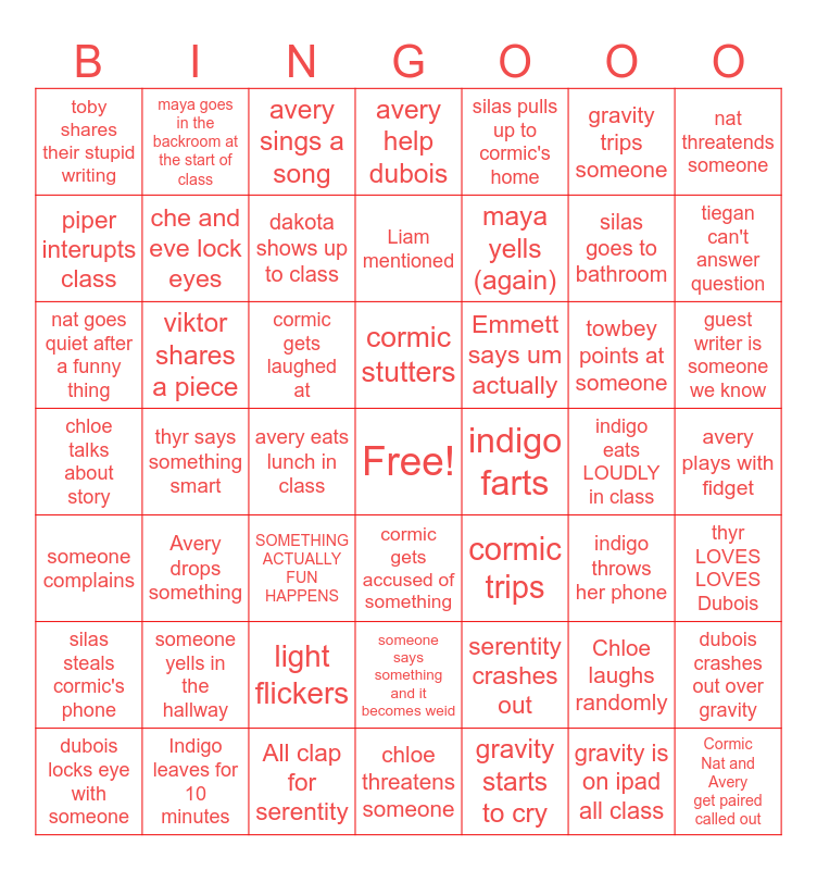 This bingo card has a free space and 48 words: serentity crashes out, silas goes to bathroom, chloe threatens someone, thyr says something smart, cormic gets laughed at, avery plays with fidget, maya goes in the backroom at the start of class, Indigo leaves for 10 minutes, gravity trips someone, cormic gets accused of something, nat threatends someone, avery help dubois, towbey points at someone, Emmett says um actually, silas steals cormic's phone, indigo eats LOUDLY in class, piper interupts class, tiegan can't answer question, Chloe laughs randomly, silas pulls up to cormic's home, maya yells (again), avery eats lunch in class, toby shares their stupid writing, che and eve lock eyes, dubois crashes out over gravity, dakota shows up to class, guest writer is someone we know, dubois locks eye with someone, cormic stutters, viktor shares a piece, gravity is on ipad all class, indigo farts, thyr LOVES LOVES Dubois, someone yells in the hallway, chloe talks about story, cormic trips, indigo throws her phone, nat goes quiet after a funny thing, SOMETHING ACTUALLY FUN HAPPENS, light flickers, someone complains, Cormic Nat and Avery get paired called out, avery sings a song, All clap for serentity, Liam mentioned, someone says something and it becomes weid, Avery drops something and gravity starts to cry.