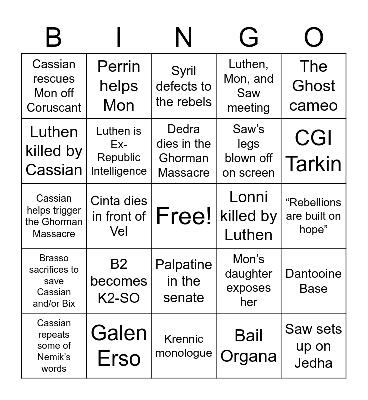 This bingo card has a free space and 24 words: B2 becomes K2-SO, Galen Erso, Dedra dies in the Ghorman Massacre, Cassian repeats some of Nemik’s words, The Ghost cameo, Cassian rescues Mon off Coruscant, Luthen killed by Cassian, Perrin helps Mon, Lonni killed by Luthen, Palpatine in the senate, Saw’s legs blown off on screen, Cassian helps trigger the Ghorman Massacre, Mon’s daughter exposes her, Dantooine Base, Luthen is Ex-Republic Intelligence, Bail Organa, “Rebellions are built on hope”, Syril defects to the rebels, CGI Tarkin, Cinta dies in front of Vel, Saw sets up on Jedha, Brasso sacrifices to save Cassian and/or Bix, Luthen, Mon, and Saw meeting and Krennic monologue.