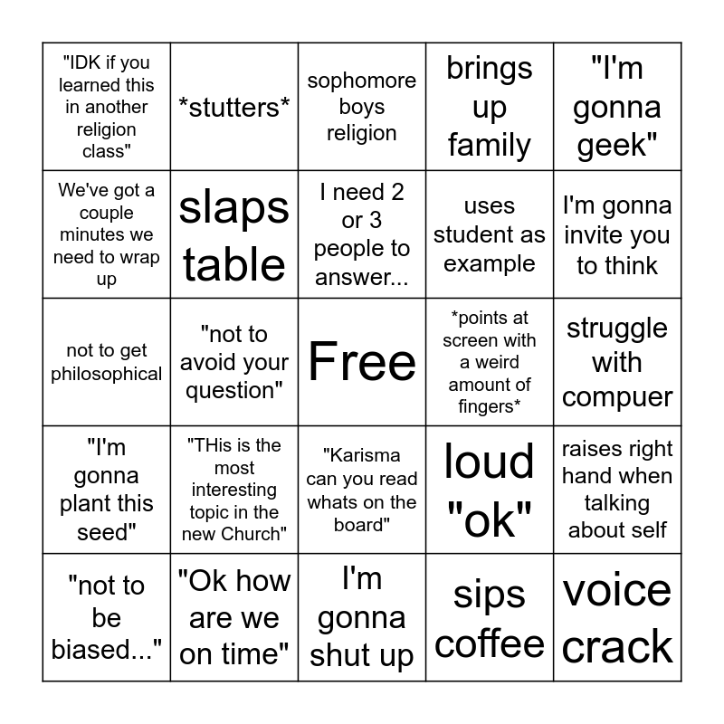 This bingo card has a free space and 24 words: "THis is the most interesting topic in the new Church", "Ok how are we on time", I need 2 or 3 people to answer..., "not to be biased...", "I'm gonna geek", "IDK if you learned this in another religion class", We've got a couple minutes we need to wrap up, *stutters*, *points at screen with a weird amount of fingers*, "Karisma can you read whats on the board", uses student as example, not to get philosophical, loud "ok", raises right hand when talking about self, slaps table, sips coffee, struggle with compuer, sophomore boys religion, I'm gonna invite you to think, "not to avoid your question", voice crack, "I'm gonna plant this seed", brings up family and I'm gonna shut up.