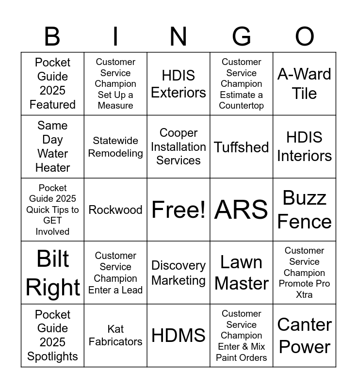 This bingo card has a free space and 24 words: Customer Service Champion Enter a Lead, Kat Fabricators, Cooper Installation Services, Pocket Guide 2025 Spotlights, A-Ward Tile, Pocket Guide 2025 Featured, Same Day Water Heater, Customer Service Champion Set Up a Measure, ARS, Discovery Marketing, Tuffshed, Pocket Guide 2025 Quick Tips to GET Involved, Lawn Master, Customer Service Champion Promote Pro Xtra, Statewide Remodeling, Customer Service Champion Enter & Mix Paint Orders, Buzz Fence, HDIS Exteriors, HDIS Interiors, Rockwood, Canter Power, Bilt Right, Customer Service Champion Estimate a Countertop and HDMS.