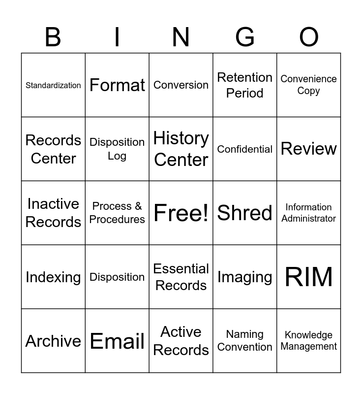 This bingo card has a free space and 94 words: A.I., Accessibility, Active Records, Administrative Records, Administrative Value, Alienated Records, Appraisal, Archive, Archivist, Asset Management, Audit, Classification, Compliance, Confidential, Content, Convenience Copy, Conversion, Custodian, Destroy, Destruction, Digital, Digitization, Disaster Recovery, Disposal, Disposition, Disposition Log, Document Lifecycle, Documentation, Electronic Record, Electronic Signature, Email, Essential Records, Evaluation, File Plan, Format, Gimmal, Governance, Historical Records, History Center, Imaging, Inactive Records, Indexing, Information Administrator, Inventory, Knowledge Management, Legal Hold, Lifecycle, Lifecycle, Metadata, Microfilm, Migration, Naming Convention, Official Record, Organization, Paper, Permanent Record, PII, PIR, Policy Manual, Preservation, Process & Procedures, Process Improvement, Protection, Purging, Record Copy, Record Custodian, Record Series, Records Analyst, Records Center, Records Control Schedule, Records Spread, Redundancy, Reference, Reporting, Retention Period, Retention Trigger, Retrieval, Review, RIM, RIM Officer, Risk Analysis, Scanning SOP, Security, Shred, Standardization, Storage, Temporary Record, Tracking, Transfer of Records, Transitory Record, Validation, Wet Signature, Workflow and Working Files.