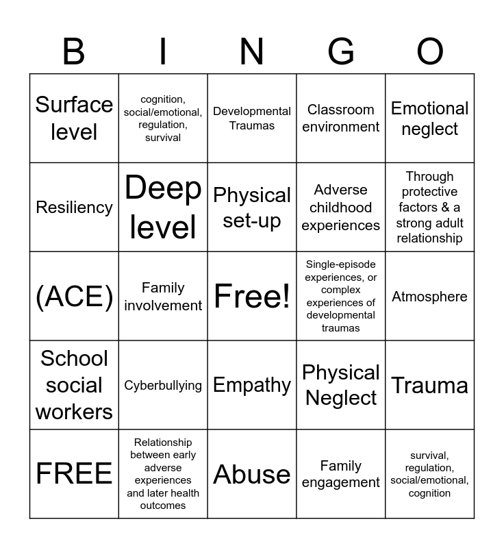 This bingo card has a free space and 26 words: Empathy, Family engagement, Physical set-up, Relationship between early adverse experiences and later health outcomes, Emotional neglect, Surface level, Resiliency, cognition, social/emotional, regulation, survival, Atmosphere, Physical Neglect, Adverse childhood experiences, (ACE), Trauma, FREE, Family involvement, Behavior management, Classroom environment, School social workers, Developmental Traumas, survival, regulation, social/emotional, cognition, Through protective factors & a strong adult relationship, Abuse, Single-episode experiences, or complex experiences of developmental traumas, Cyberbullying, Deep level and Bullying.