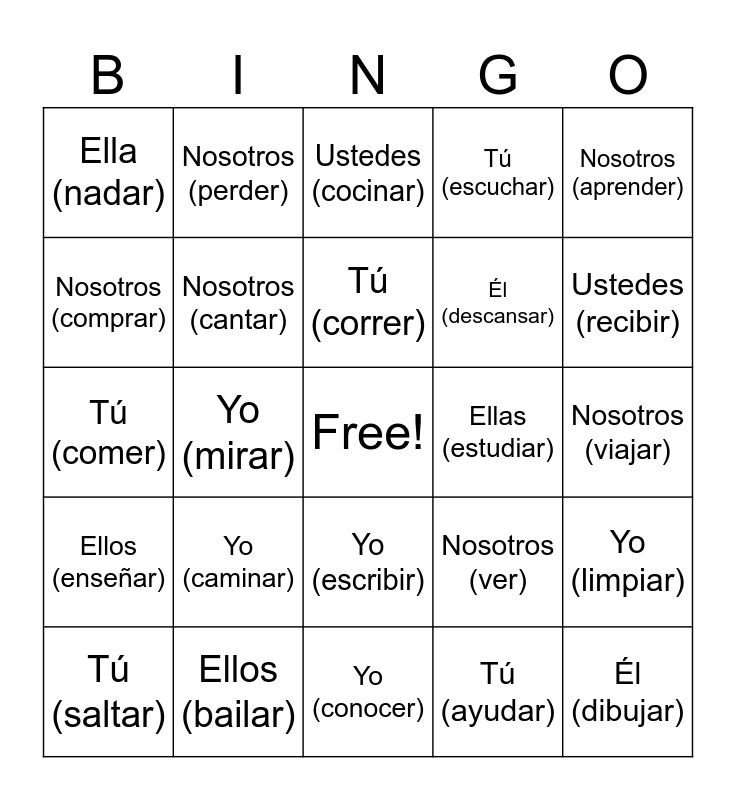 This bingo card has a free space and 40 words: Yo (hablar), Tú (comer), Él (vivir), Nosotros (cantar), Ellos (bailar), Yo (escribir), Tú (correr), Ella (leer), Nosotros (aprender), Ellos (enseñar), Yo (mirar), Tú (escuchar), Él (dibujar), Nosotros (viajar), Ellas (estudiar), Yo (caminar), Tú (jugar), Ella (nadar), Nosotros (trabajar), Ustedes (cocinar), Yo (limpiar), Tú (ayudar), Él (descansar), Nosotros (comprar), Ellos (visitar), Yo (abrir), Tú (cerrar), Ella (pensar), Nosotros (soñar), Ellas (conversar), Yo (practicar), Tú (saltar), Él (leer), Nosotros (ver), Ustedes (recibir), Yo (conocer), Tú (decidir), Ella (beber), Nosotros (perder) and Ellos (esperar).