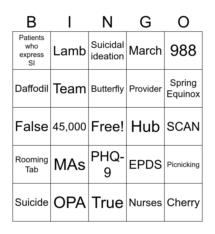 This bingo card has a free space and 29 words: Suicide, 25, 45,000, Ligature risk, Patients who express SI, Suicidal ideation, Team, MAs, Hub, OPA, SCAN, Cherry, True, Nurses, Spring Equinox, Suicide Risk Screener, PHQ-9, Rooming Tab, 988, False, EPDS, Put the patient on hold or transfer the call, Provider, Daffodil, March, Lamb, Picnicking, Butterfly and April.