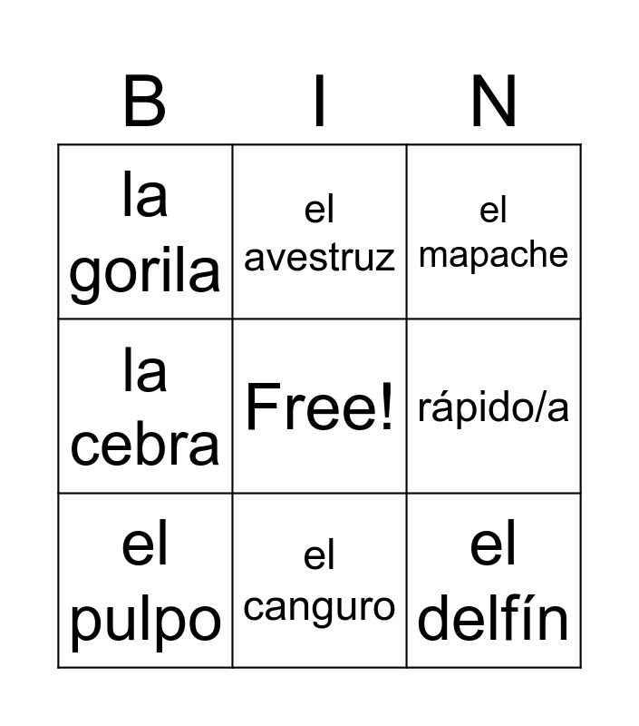 This bingo card has a free space and 11 words: alto/a, el canguro, el delfín, el pulpo, el avestruz, el mapache, rápido/a, bajo/a, la cebra, la gorila and el murciélago.