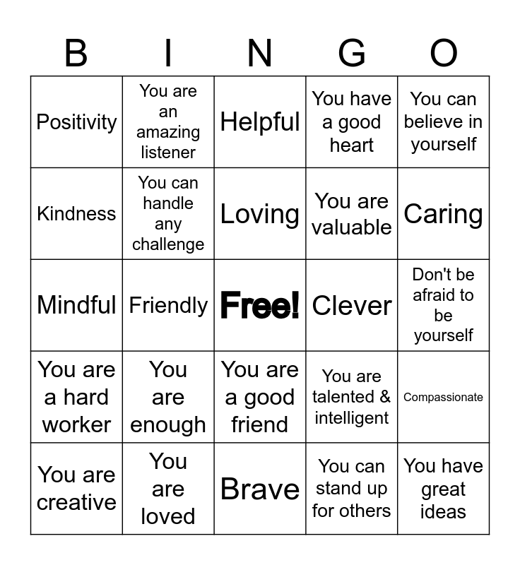 This bingo card has a free space and 29 words: You are creative, Amazing, Friendly, I am proud of you, Positivity, Helpful, You can handle any challenge, You are enough, Clever, You are loved, Don't be afraid to be yourself, You have great ideas, Brave, You can stand up for others, Caring, I am enough, You are a good friend, You are a hard worker, You can believe in yourself, Mindful, You are talented & intelligent, Strong, You are valuable, Kindness, You have a good heart, You are an amazing listener, Compassionate, Loving and Respected.