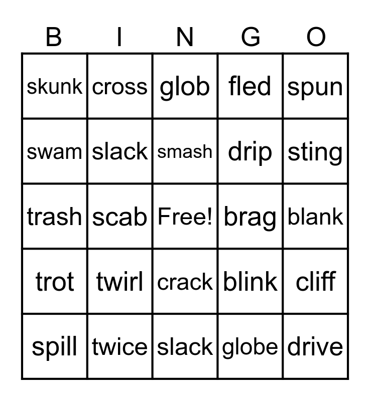 This bingo card has a free space and 69 words: sniff, blank, grab, plum, twice, pluck, fled, cling, spun, swim, cliff, stop, skunk, glob, smooth, scab, crack, drip, frost, trot, brag, blink, sting, smash, twine, print, skull, sleep, globe, smear, cross, crab, gland, plan, flock, skin, split, fresh, swam, splash, twirl, drive, snail, plus, twist, spill, press, skit, trust, slack, smash, bring, scout, slack, snag, grow, twice, clap, prance, trash, slip, glare, brass, scat, crush, drip, track, frost and glum.