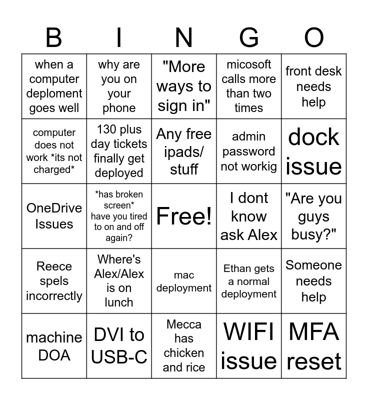 This bingo card has a free space and 49 words: deploment takes more than 2 hours, MFA reset, Cheryl mad at Brooklyn, Mecca has chicken and rice, Where's Alex/Alex is on lunch, someone says room needs cleaned, why are you on your phone, max pants have a hole, computer does not work *its not charged*, someone ask for a golf chart, 130 plus day tickets finally get deployed, micosoft calls more than two times, Someone needs help, Ethan gets a normal deployment, company portal, printer issue, Any free ipads/ stuff, I dont know ask Alex, not knowing where the deploment is, front desk needs help, *has broken screen* have you tired to on and off again?, WIFI issue, when a computer deploment goes well, admin password not workig, Jace gets time off, dock issue, machine DOA, skill issue, mac deployment, Reece spels incorrectly, someone calls in, "Have you activated your roles?", Hardware has a gross computer, Autopilot fails *AGAIN*, DVI to USB-C, can I have you sign in, Someone knocking on the door, AA Macbook, "Are you guys busy?", Dan is here!, Andrew is here!, Bob, Cheryl's door is closed, HP Spicy Pillow, OneDrive Issues, "More ways to sign in", Old TSC Staff member mentioned, "Let me remote in" and Account locked.