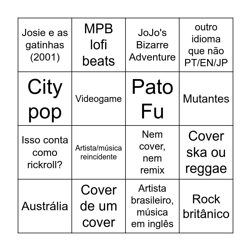 This bingo card has 16 words: Cover de um cover, Cover ska ou reggae, JoJo's Bizarre Adventure, Josie e as gatinhas (2001), Isso conta como rickroll?, MPB lofi beats, Nem cover, nem remix, Artista brasileiro, música em inglês, City pop, Videogame, Austrália, outro idioma que não PT/EN/JP, Artista/música reincidente, Mutantes, Pato Fu and Rock britânico.