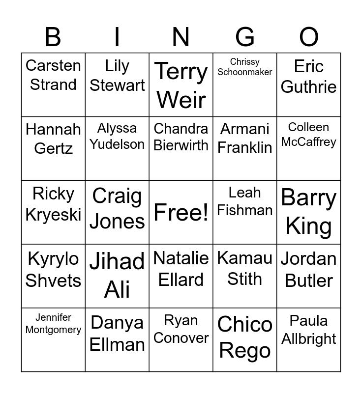 This bingo card has a free space and 24 words: Jihad Ali, Danya Ellman, Chandra Bierwirth, Jennifer Montgomery, Eric Guthrie, Carsten Strand, Hannah Gertz, Lily Stewart, Leah Fishman, Natalie Ellard, Armani Franklin, Ricky Kryeski, Kamau Stith, Jordan Butler, Alyssa Yudelson, Chico Rego, Barry King, Terry Weir, Colleen McCaffrey, Craig Jones, Paula Allbright, Kyrylo Shvets, Chrissy Schoonmaker and Ryan Conover.