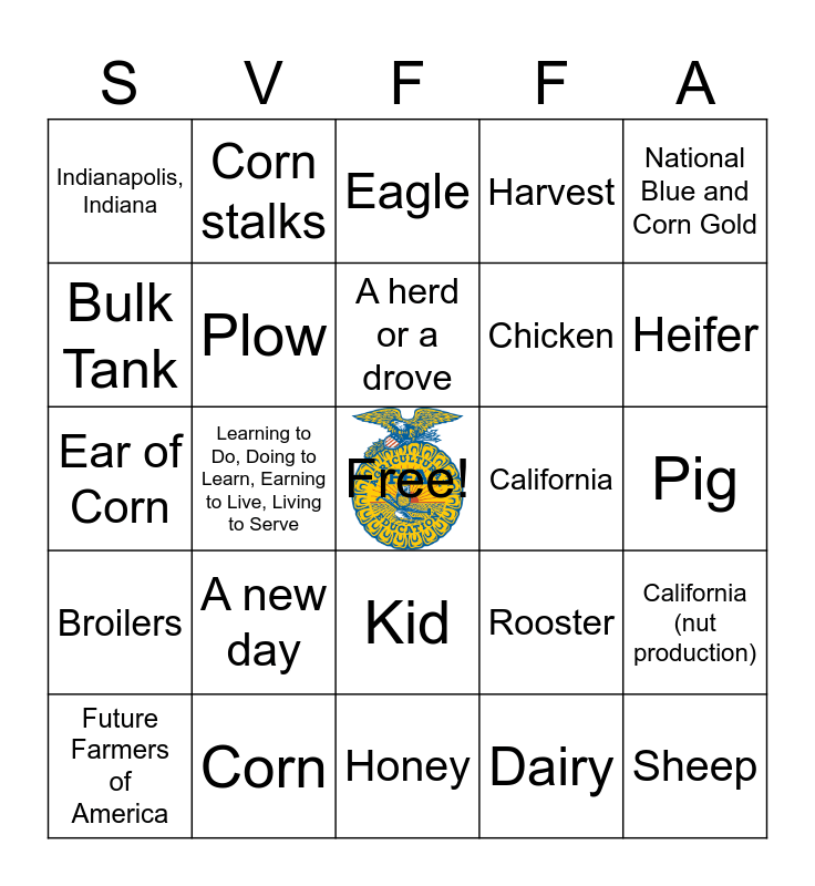 This bingo card has a free space and 29 words: Future Farmers of America, 1928, Learning to Do, Doing to Learn, Earning to Live, Living to Serve, Blue and Gold, Indianapolis, Indiana, Eagle, Plow, A new day, California, Corn, Pig, Sheep, Honey, Dairy, Heifer, Wheat, Kid, Broilers, National Blue and Corn Gold, Ear of Corn, Rooster, Calcium, Chicken, Bulk Tank, Harvest, Corn stalks, California (nut production), A herd or a drove and Soybeans.