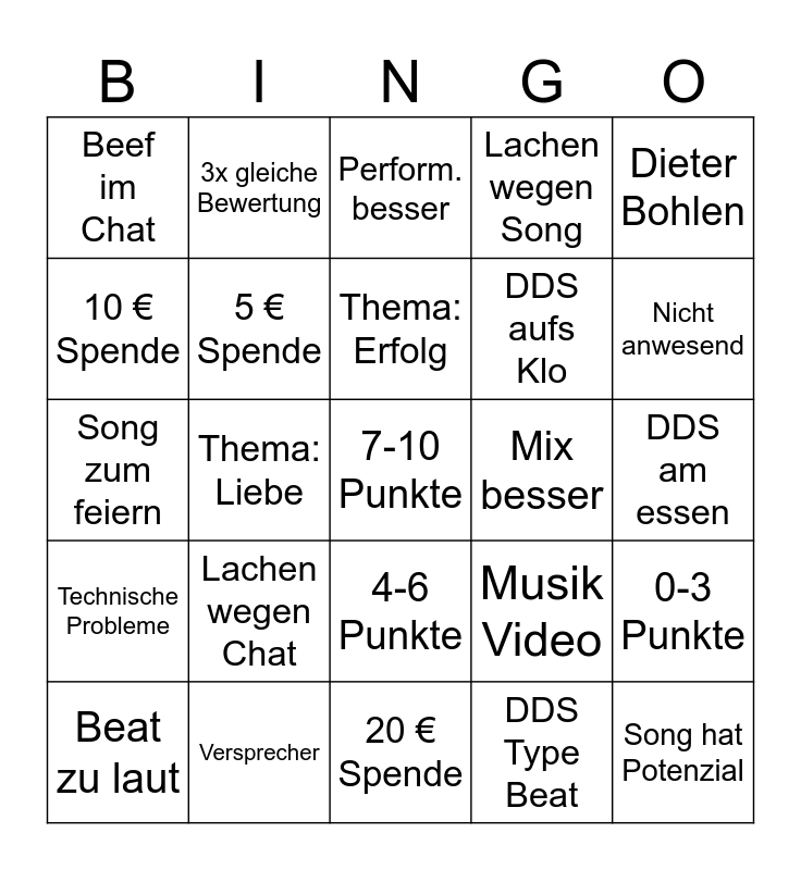 This bingo card has 25 words: Technische Probleme, Versprecher, 7-10 Punkte, DDS Type Beat, Dieter Bohlen, Beef im Chat, 3x gleiche Bewertung, Perform. besser, Mix besser, 0-3 Punkte, 10 € Spende, 5 € Spende, 20 € Spende, Musik Video, Nicht anwesend, Beat zu laut, Thema: Liebe, Thema: Erfolg, DDS aufs Klo, DDS am essen, Song zum feiern, Lachen wegen Chat, 4-6 Punkte, Lachen wegen Song and Song hat Potenzial.