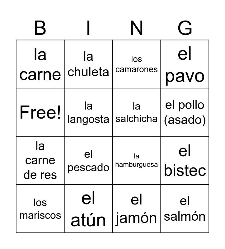 This bingo card has 16 words: el atún, el bistec, los camarones, la carne, la carne de res, la chuleta, la hamburguesa, el jamón, Free!, la langosta, los mariscos, el pavo, el pescado, el pollo (asado), la salchicha and el salmón.