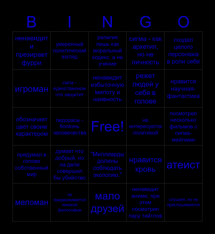 This bingo card has a free space and 24 words: думает что добрый, но на деле совершил бы убийство, не придерживается никакой философии, ненавидит избыточную милоту и наивность, меломан, создал целого персонажа в роли себя, ненавидит и презирает фурри, игроман, умеренный политический взгляд, не интересуется политикой, "Миллиарды должны соблюдать экологию.", режет людей у себя в голове, обозначает цвет своим характером, нравится кровь, атеист, сила - единственное что защитит, ненавидит аниме, при этом посмотрел пару тайтлов, посмотрел несколько фильмов с сигма-мейлами, религия лишь как моральный кодекс, а не учение, нравится научная-фантастика, пидорасы - болезнь человечества, слушает, но не прислушивается, придумал в голове собственный мир, сигма - как архетип, но не личность and мало друзей.