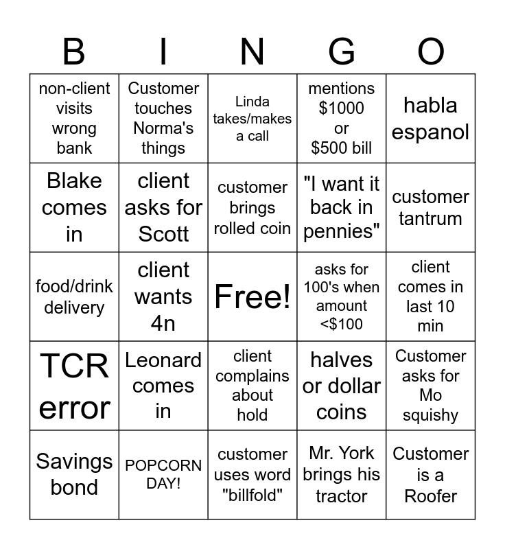 This bingo card has a free space and 29 words: Savings bond, customer complains about showing ID, client wants 4n, non-client check > 10k, non-client visits wrong bank, Linda takes/makes a call, client asks for Scott, Leonard comes in, asks for 100's when amount <$100, POPCORN DAY!, client comes in last 10 min, Customer is a Roofer, customer uses word "billfold", Mr. York brings his tractor, customer tantrum, non-client wants 4n, client complains about hold, TCR error, habla espanol, food/drink delivery, halves or dollar coins, Notary, "I want it back in pennies", Blake comes in, mentions $1000 or $500 bill, Customer touches Norma's things, Customer asks for Mo squishy, customer brings rolled coin and Silver dollars.