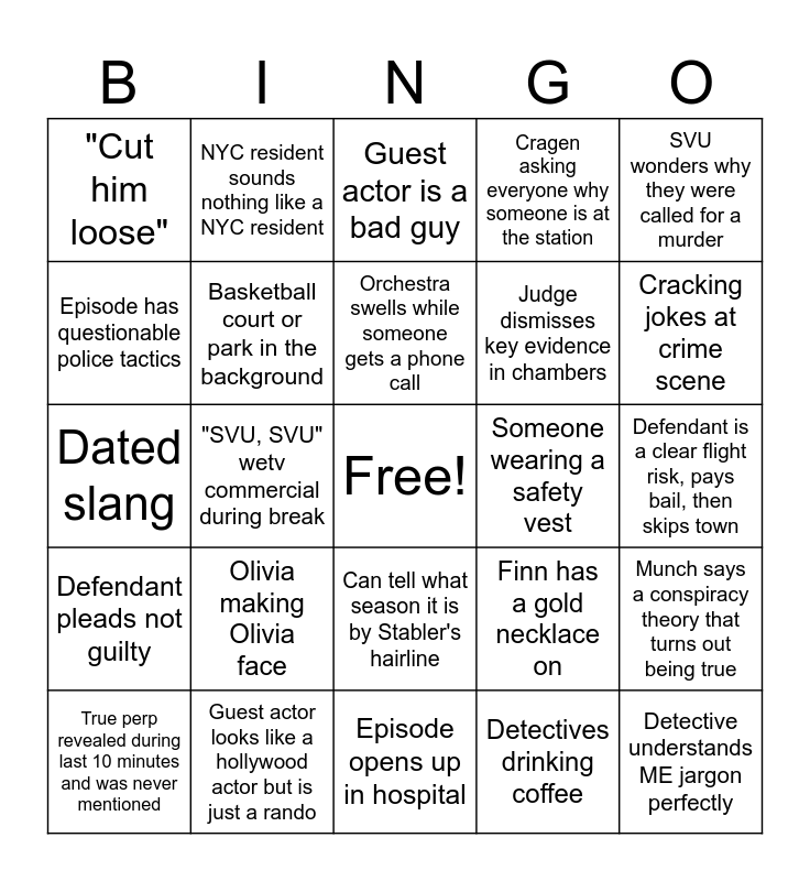 This bingo card has a free space and 24 words: Olivia making Olivia face, Guest actor looks like a hollywood actor but is just a rando, Orchestra swells while someone gets a phone call, True perp revealed during last 10 minutes and was never mentioned, SVU wonders why they were called for a murder, "Cut him loose", Episode has questionable police tactics, NYC resident sounds nothing like a NYC resident, Someone wearing a safety vest, Can tell what season it is by Stabler's hairline, Judge dismisses key evidence in chambers, Dated slang, Finn has a gold necklace on, Munch says a conspiracy theory that turns out being true, Basketball court or park in the background, Detectives drinking coffee, Defendant is a clear flight risk, pays bail, then skips town, Guest actor is a bad guy, Cracking jokes at crime scene, "SVU, SVU" wetv commercial during break, Detective understands ME jargon perfectly, Defendant pleads not guilty, Cragen asking everyone why someone is at the station and Episode opens up in hospital.