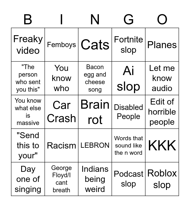 This bingo card has a free space and 24 words: Racism, George Floyd/I cant breath, Bacon egg and cheese song, Day one of singing, Planes, Freaky video, "The person who sent you this", Femboys, Disabled People, LEBRON, Ai slop, You know what else is massive, Words that sound like the n word, KKK, You know who, Podcast slop, Edit of horrible people, Cats, Let me know audio, Car Crash, Roblox slop, "Send this to your", Fortnite slop and Indians being weird.