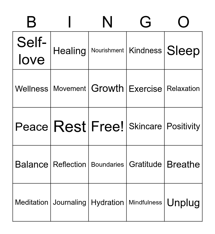 This bingo card has a free space and 25 words: Reflection, Hydration, Growth, Meditation, Sleep, Self-love, Wellness, Healing, Skincare, Boundaries, Exercise, Peace, Gratitude, Breathe, Movement, Nature, Positivity, Nourishment, Relaxation, Rest, Unplug, Journaling, Balance, Kindness and Mindfulness.