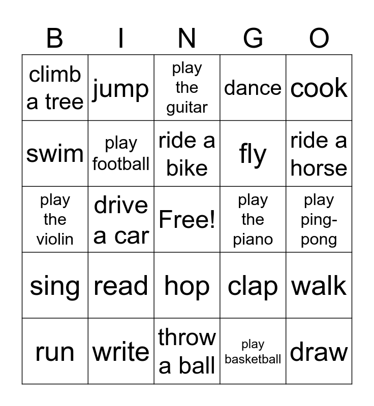 This bingo card has a free space and 24 words: read, write, ride a bike, run, cook, climb a tree, swim, jump, play the piano, hop, fly, play the violin, clap, walk, play football, play basketball, play ping-pong, play the guitar, ride a horse, drive a car, draw, sing, dance and throw a ball.