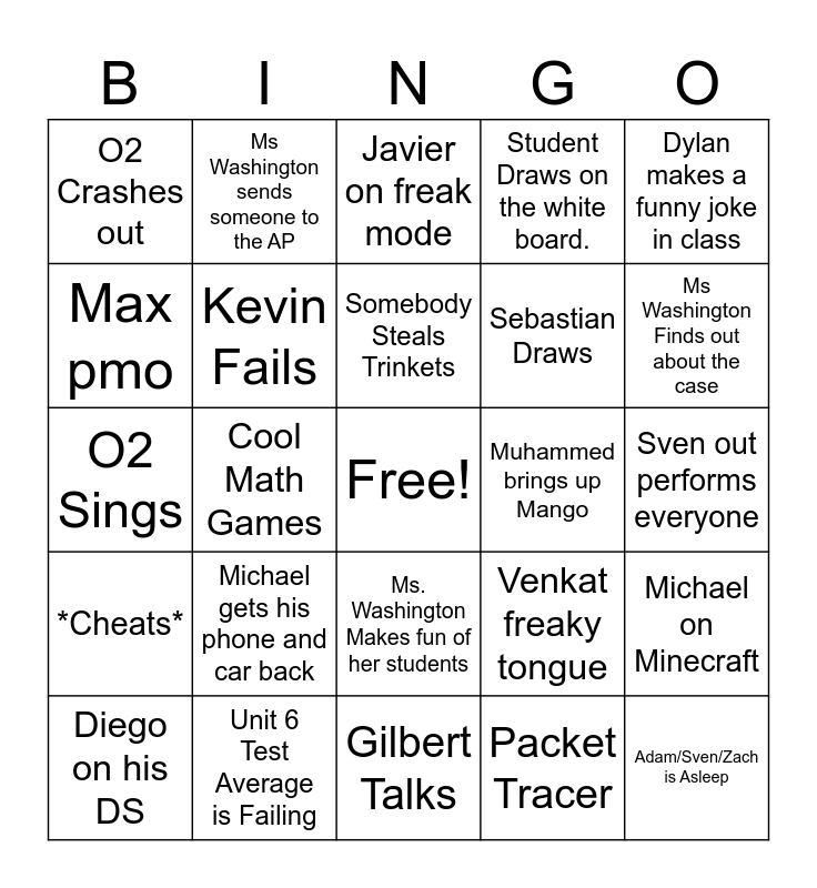 This bingo card has a free space and 30 words: Unit 6 Test Average is Failing, Wordle or Connections, Cool Math Games, Skills USA Talk, O2 Crashes out, Javier on freak mode, Kevin Fails, Ms. Washington Makes fun of her students, Muhammed brings up Mango, Gilbert Talks, Sven out performs everyone, Adam/Sven/Zach is Asleep, Packet Tracer, Gabriel is still behind, Ms Washington Finds out about the case, Angie Talks, Venkat freaky tongue, *Cheats*, Michael gets his phone and car back, Dylan makes a funny joke in class, O2 Sings, Max says something gay, Ms Washington sends someone to the AP, Sebastian Draws, Max pmo, Student Draws on the white board., Michael on Minecraft, Diego on his DS, Somebody Steals Trinkets and "Skibidi".