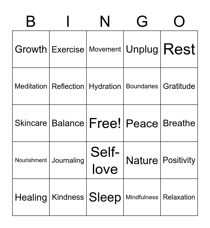 This bingo card has a free space and 25 words: Journaling, Sleep, Hydration, Healing, Rest, Growth, Meditation, Exercise, Peace, Self-love, Boundaries, Skincare, Nature, Positivity, Reflection, Wellness, Breathe, Movement, Gratitude, Balance, Relaxation, Kindness, Nourishment, Unplug and Mindfulness.