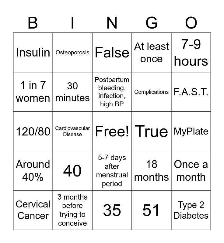 This bingo card has a free space and 24 words: 40, 3 months before trying to conceive, Postpartum bleeding, infection, high BP, Cervical Cancer, 7-9 hours, Insulin, 1 in 7 women, Osteoporosis, True, 5-7 days after menstrual period, Complications, 120/80, 18 months, Once a month, 30 minutes, 51, MyPlate, False, F.A.S.T., Cardiovascular Disease, Type 2 Diabetes, Around 40%, At least once and 35.